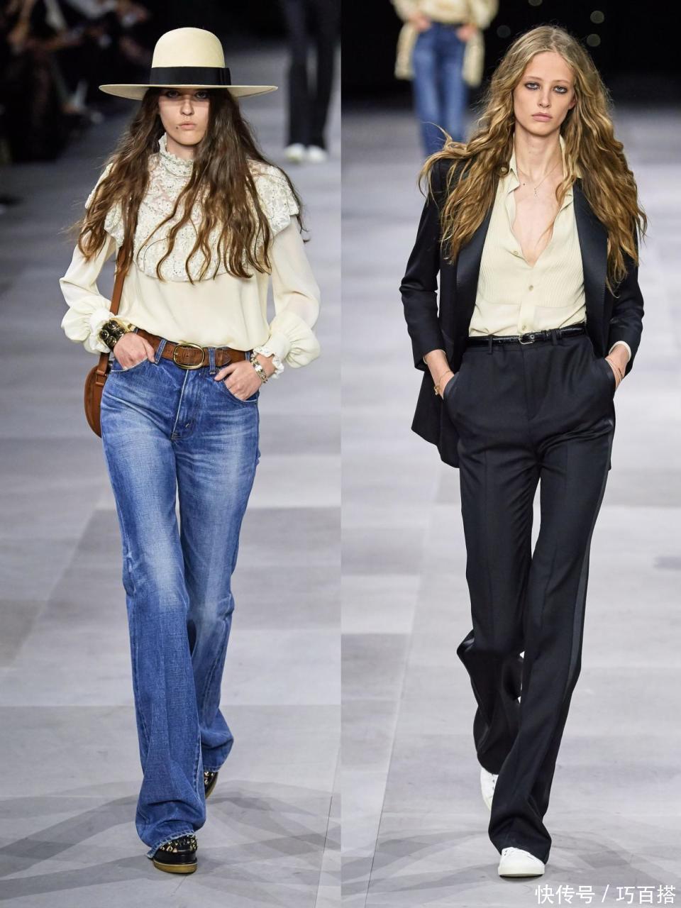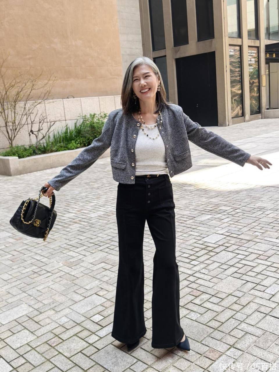为了规避这一问题,50+女性在选择时可以优先考虑高腰直筒裤,上身干净利索的款式既能遮肉显瘦又能保证绝对精致干练。