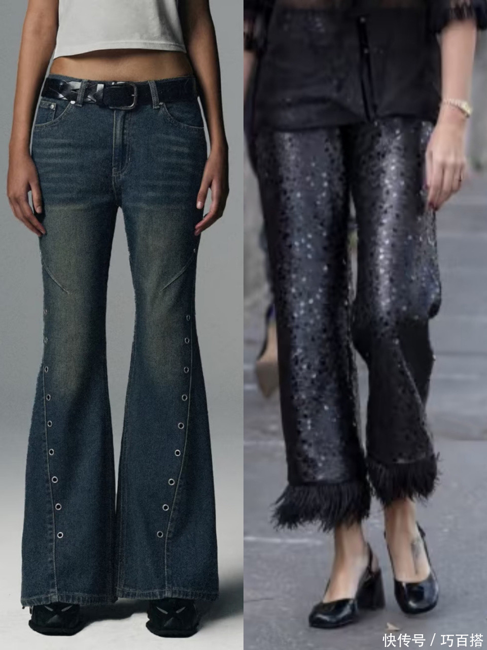 亮片/铆钉款裤子自带膨胀感,显胖不说还容易把视线吸引到臀部和大腿,会无限放大身材缺陷。